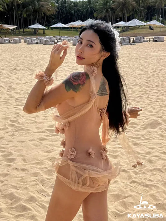 ROSE SWIMWEAR FLORAL BIKINI SHEER BEACHWEAR SEXY ONE-PIECE SWIMSUIT SUMMER VACATION OUTFIT